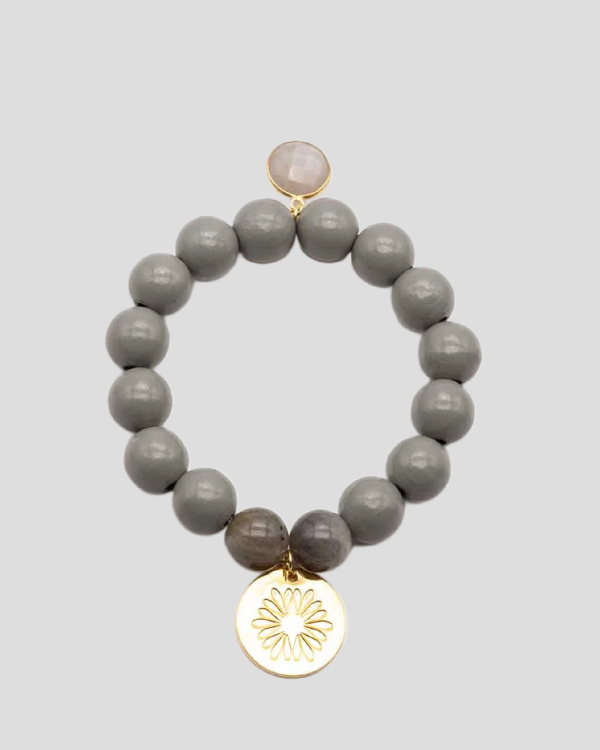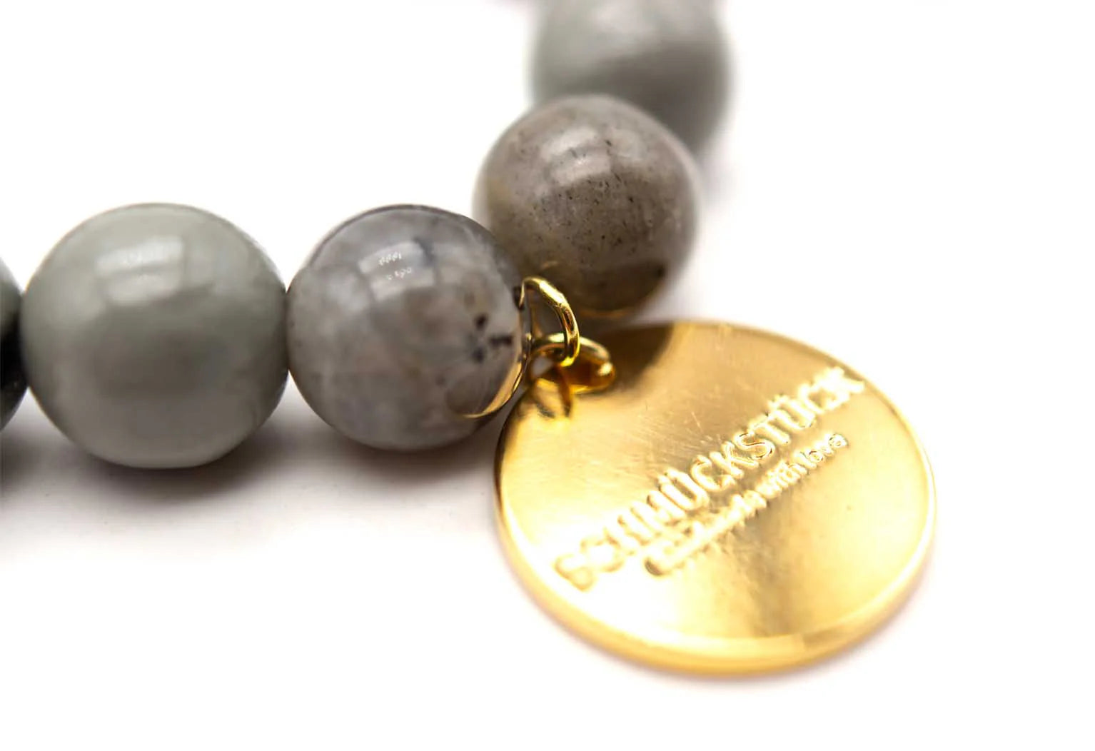 Armband auf Elastikband, Sterlingsilber vergoldet, Holzperlen 12mm grau, Perlen aus Labradorit, Mondstein-Anhänger und Logo-Tag aus vergoldetem Messing