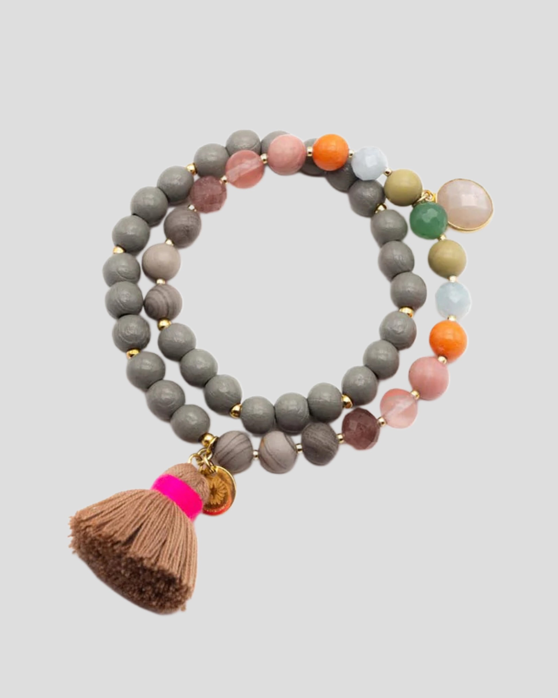 Armband doppelt auf Elastikband, Sterlingsilber vergoldet, Holzperlen, diverse Edelsteinperlen, Mondstein-Anhänger und Quaste