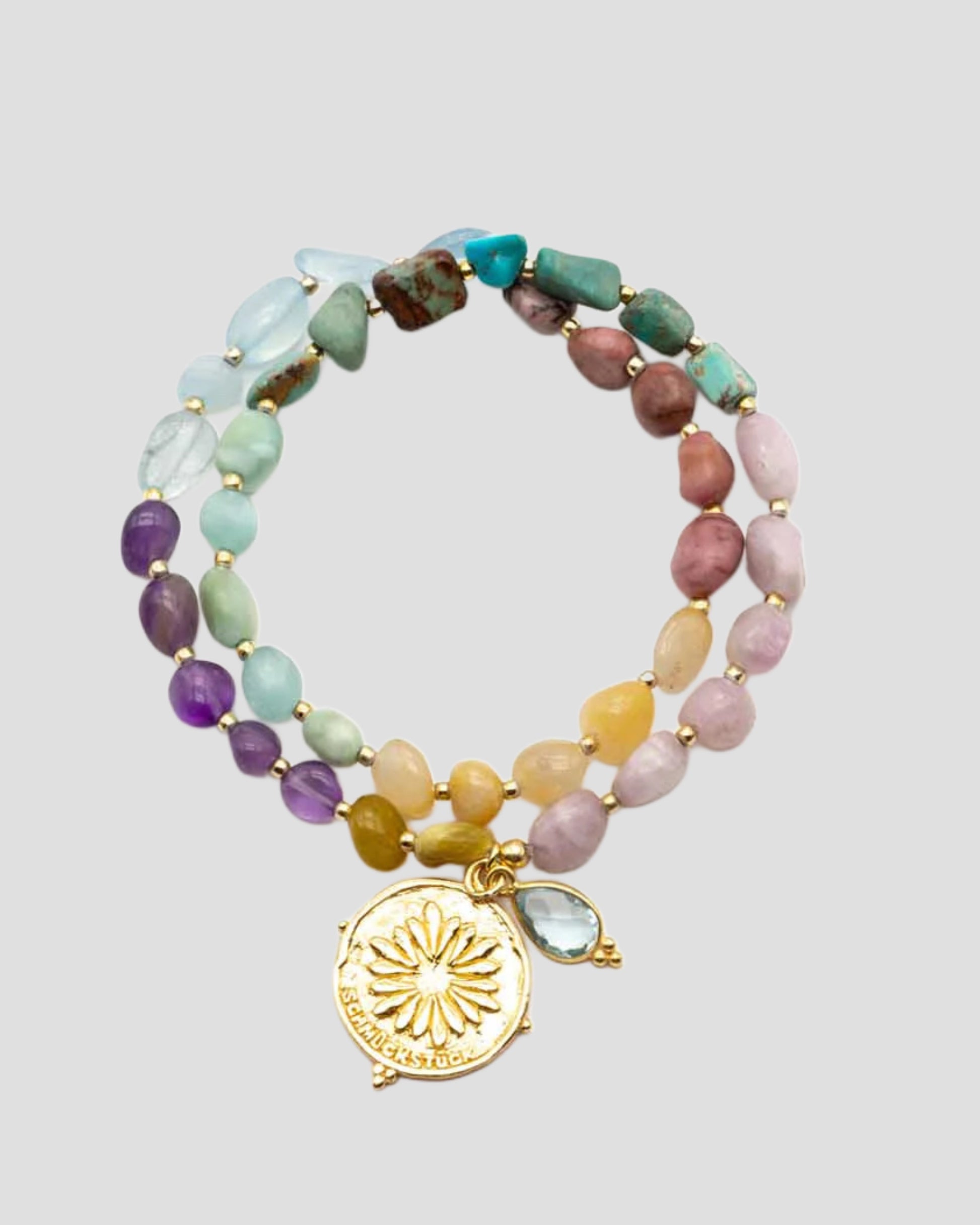 Armband doppelt auf Elastikband, Sterlingsilber vergoldet, diverse Edelsteinperlen, Aquamarin-Anhänger und Münze