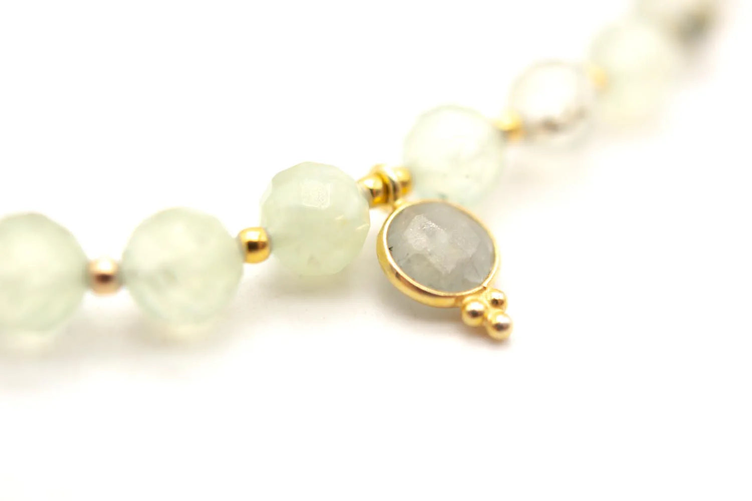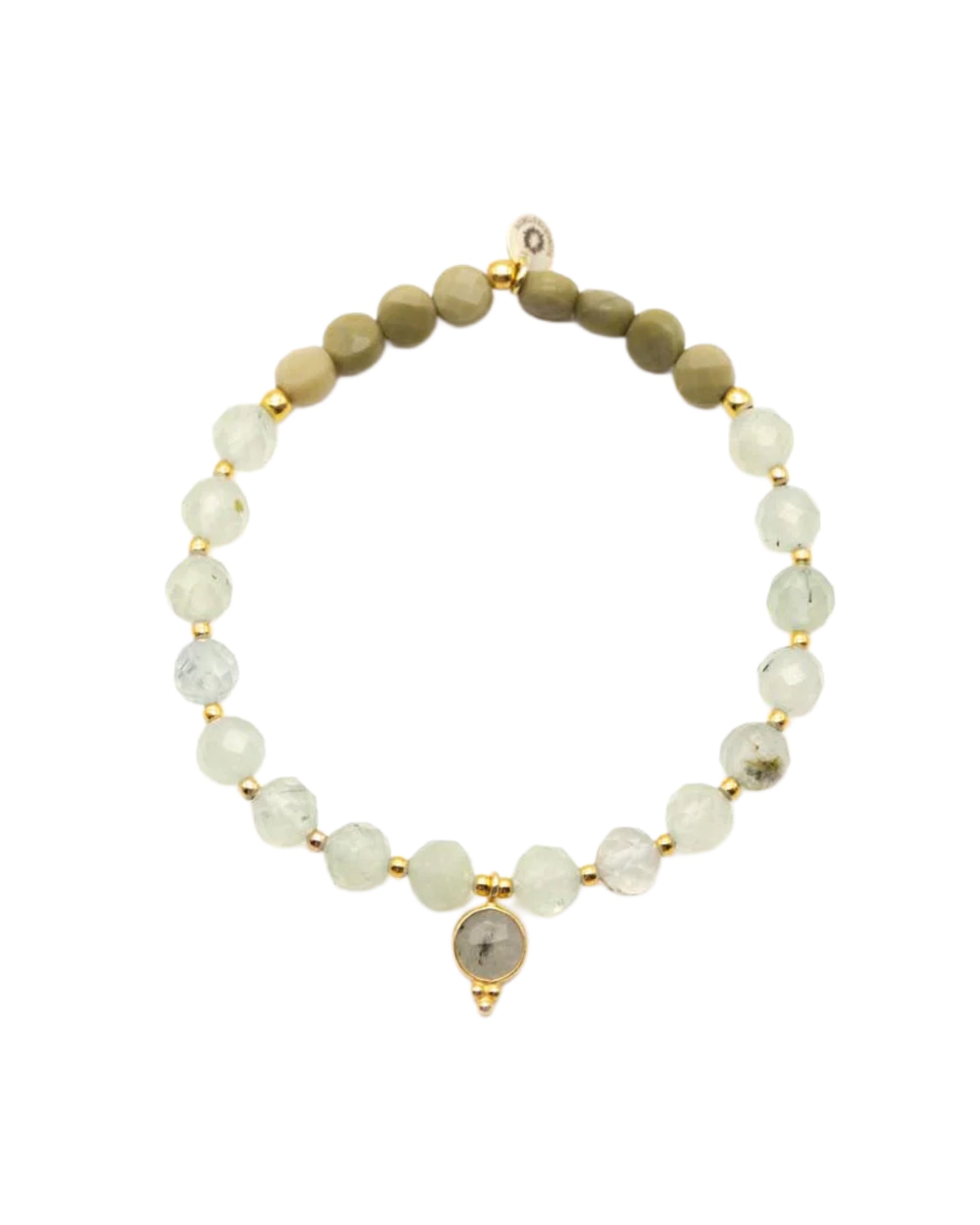 Armband auf Elastikband mit Sterlingsilber vergoldet, Perlen (6mm) aus Prehnit und Jaspis, Prehnit-Anhänger